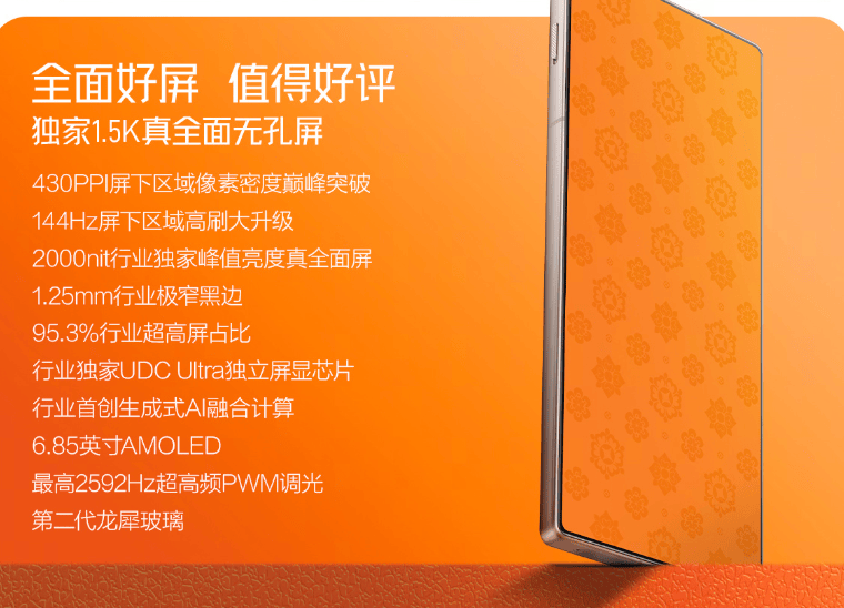具体规格方面,其正面配备6.85英寸1.5K无孔全面屏,屏幕黑边宽度缩小至1.25毫米,获得了95.3%的高屏占比;支持144Hz智能刷新率、2000nit峰值亮度、430PPI屏下像素密度。对用户关注的预览清晰度、复杂光线场景、视频通话效果进行了重点提升。