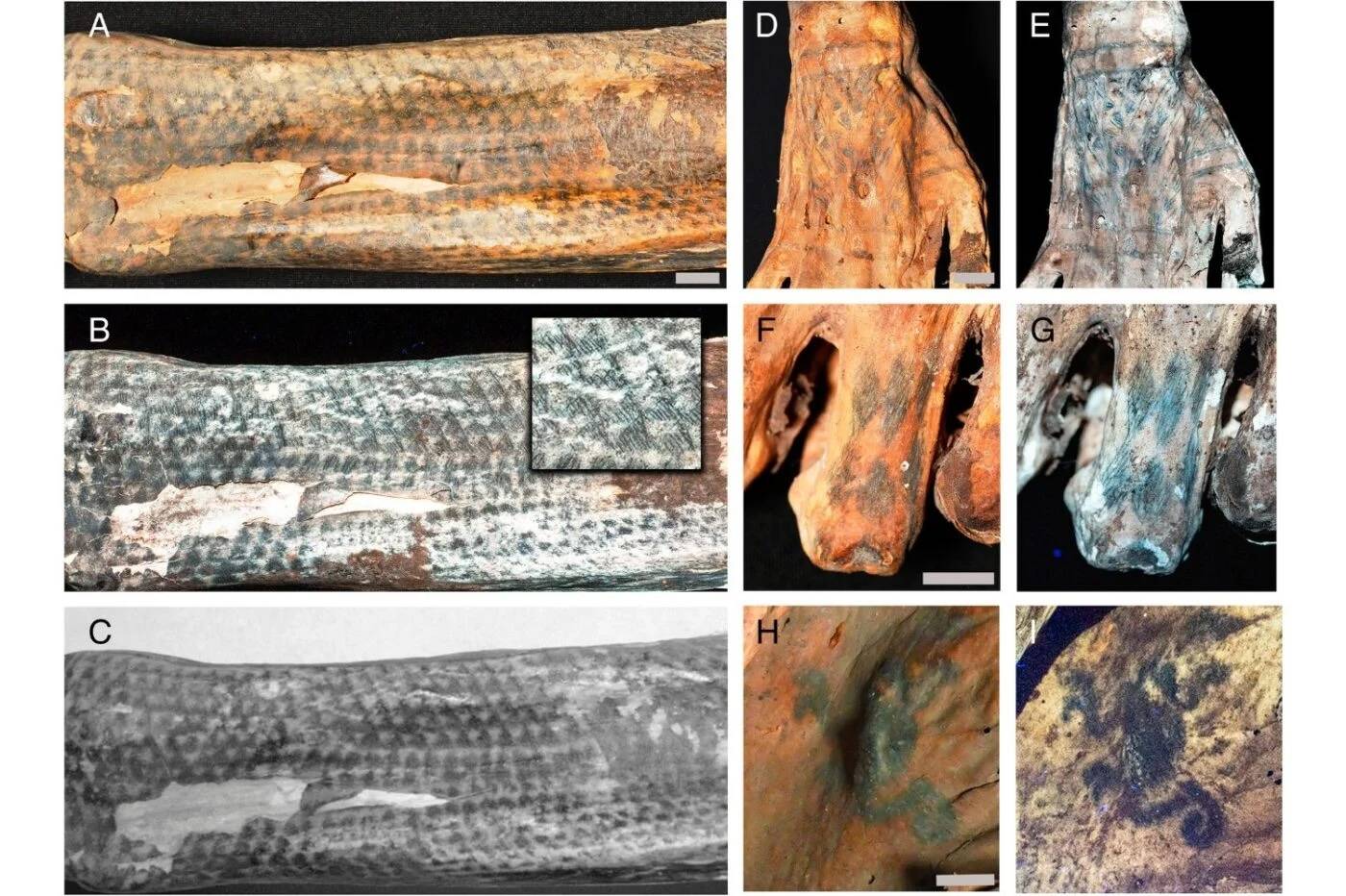 纹身作为一种艺术表现形式已经存在了5000多年,最古老的例子是著名的冰人奥茨(Otzi),他于公元前3300年左右死于奥地利和意大利之间的阿尔卑斯山。然而,由于古代软组织的遗迹非常罕见,而且纹身会随着时间的推移而褪色和散开 —— 这种情况显然会随着身体死后的腐烂而恶化 —— 考古学家几乎没有机会研究这种古老的艺术形式。根据这项研究,在出现纹身的机会中,研究人员一直使用红外成像技术来分析纹身的设计,但仍然无法揭示纹身的细节。