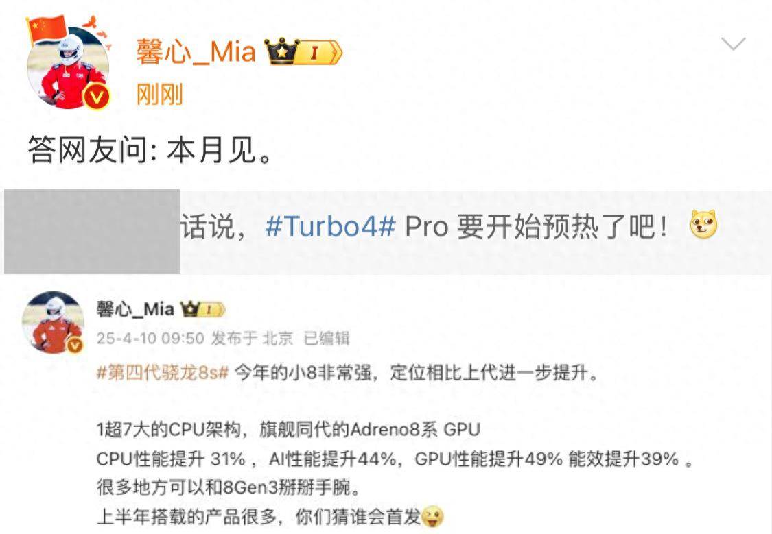 4月14日,红米产品经理馨心回答了网友的疑问:红米Turbo4 Pro本月(4月)见,综合目的爆料来看,发布时间应该是4月下旬。该机主打性能和长续航,还有很多网友喜欢的金属中框,是一款性价比不错的中高端性能手机。目前该机的核心参数已经曝光,让我们一起先睹为快。(图片仅供参考)