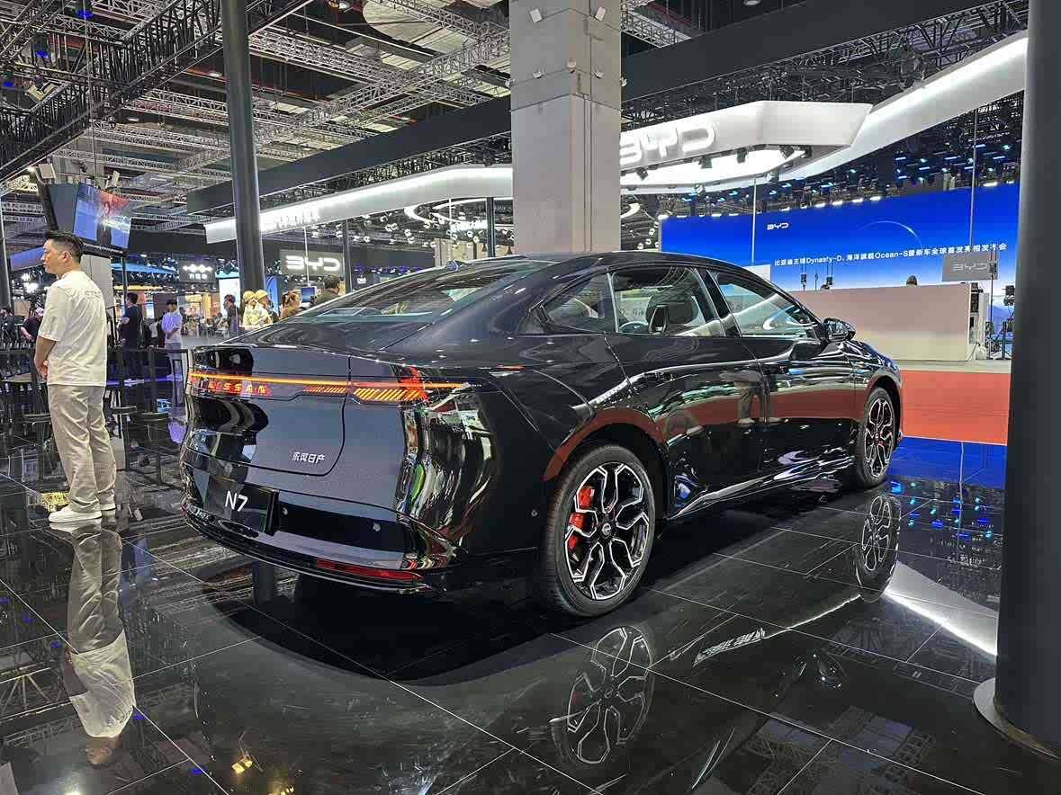 车身侧面来看,日产N7的车长为4930mm,配备无三角窗无框车门、隐藏式门把手和隐藏式腰线,车身线条流畅动感。车辆尾部采用贯穿式尾灯设计,配合熏黑后包围设计,进一步提升车身的层次感。