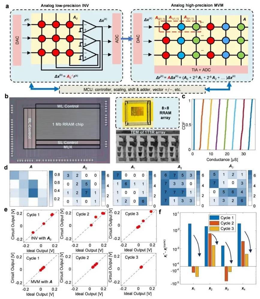 这款新型芯片的核心价值,既体现在技术突破上,更彰显于产业应用的可行性。从技术原理看,团队采用阻变存储器作为核心器件,其可编程的电阻特性实现了“存算一体”,避免了传统冯·诺依曼架构中计算与存储分离的效能损耗;通过原创电路设计与迭代优化算法,仅需数次迭代即可将计算精度逼近数字芯片的浮点32位水平,能完美适配AI大模型训练、6G通信、具身智能等前沿场景的算力需求。更关键的是,该芯片无需依赖高端光刻机,依托现有成熟制程即可量产,大幅降低了对外部设备的依赖,破解了“无高端光刻机就造不出先进芯片”的困局。