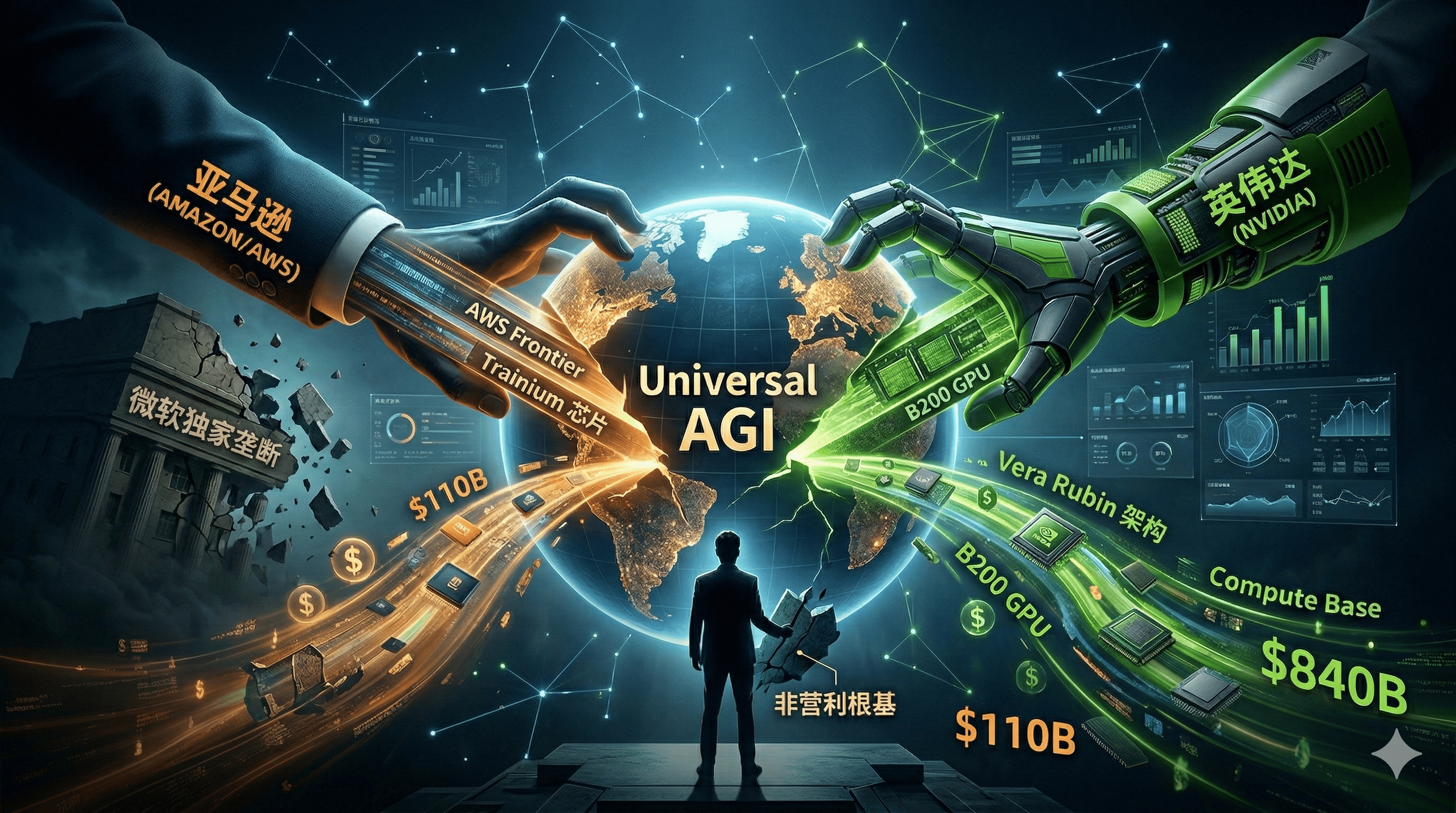 近日,OpenAI完成1100亿美元巨额融资,投前估值达7300亿美元,亚马逊、英伟达与软银成为核心投资方,其中亚马逊豪掷500亿美元,英伟达出资300亿美元。这场史上最大规模的AI融资,不仅为OpenAI的AGI研发注入强心剂,更揭开了亚马逊与英伟达瓜分AI霸权的序幕,两大巨头凭借各自优势,在算力、生态、产业链等维度展开激烈博弈,重塑全球AI产业格局。