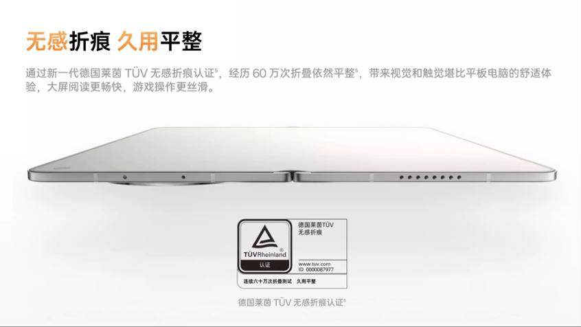 与之协同的天穹记忆玻璃,则解决了屏幕材料不可逆形变的难题。这款全新研发的玻璃采用超坚固基材,经深度化学强化,抗弯曲形变能力提升至传统柔性玻璃的338%,更具备99.9%的形状自修复能力,如同记忆枕一般,折叠后展开可快速回弹淡化折痕。凭借这两大技术,该机通过莱茵TUV无感折痕认证,连续60万次折叠后依旧平整,真正实现“不止出厂平,久用依然平”。